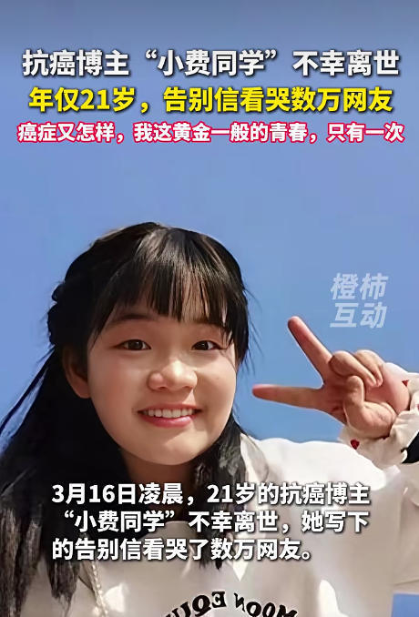 3月16日凌晨,21岁的抗癌博主“小费同学”不幸离世,她写下的告别信看哭了数万网友。